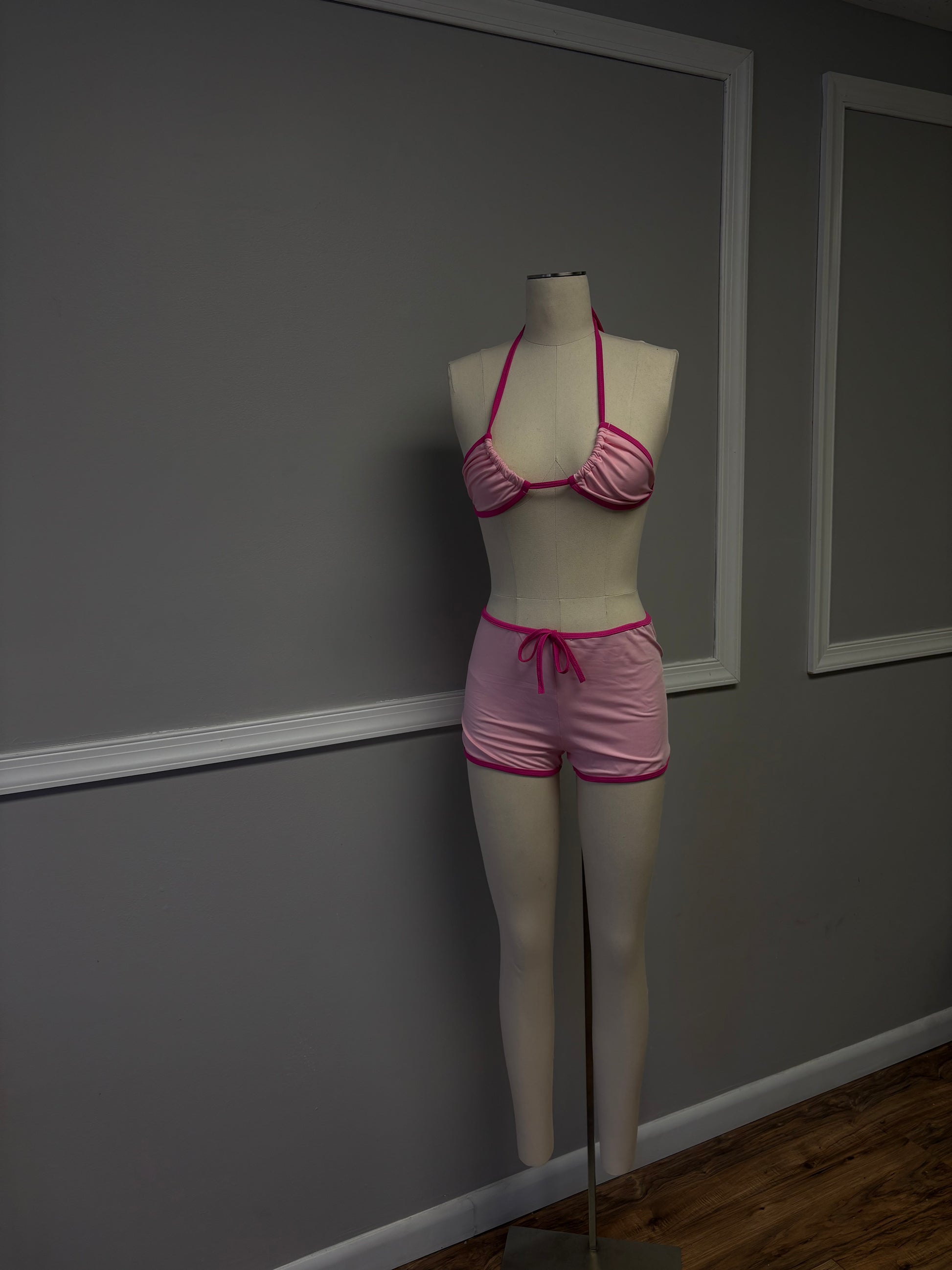 Get ready to hit the beach in style with Penelope! This matching set in two shades of pink is perfect for girly girls. The bathing suit top and matching shorts will make you stand out and feel confident.